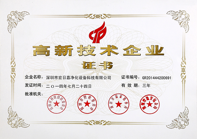 熱烈慶祝深圳市宏日嘉凈化設(shè)備科技有限公司通過國家高新技術(shù)企業(yè)認定,并獲得國家高新技術(shù)企業(yè)榮譽證書。