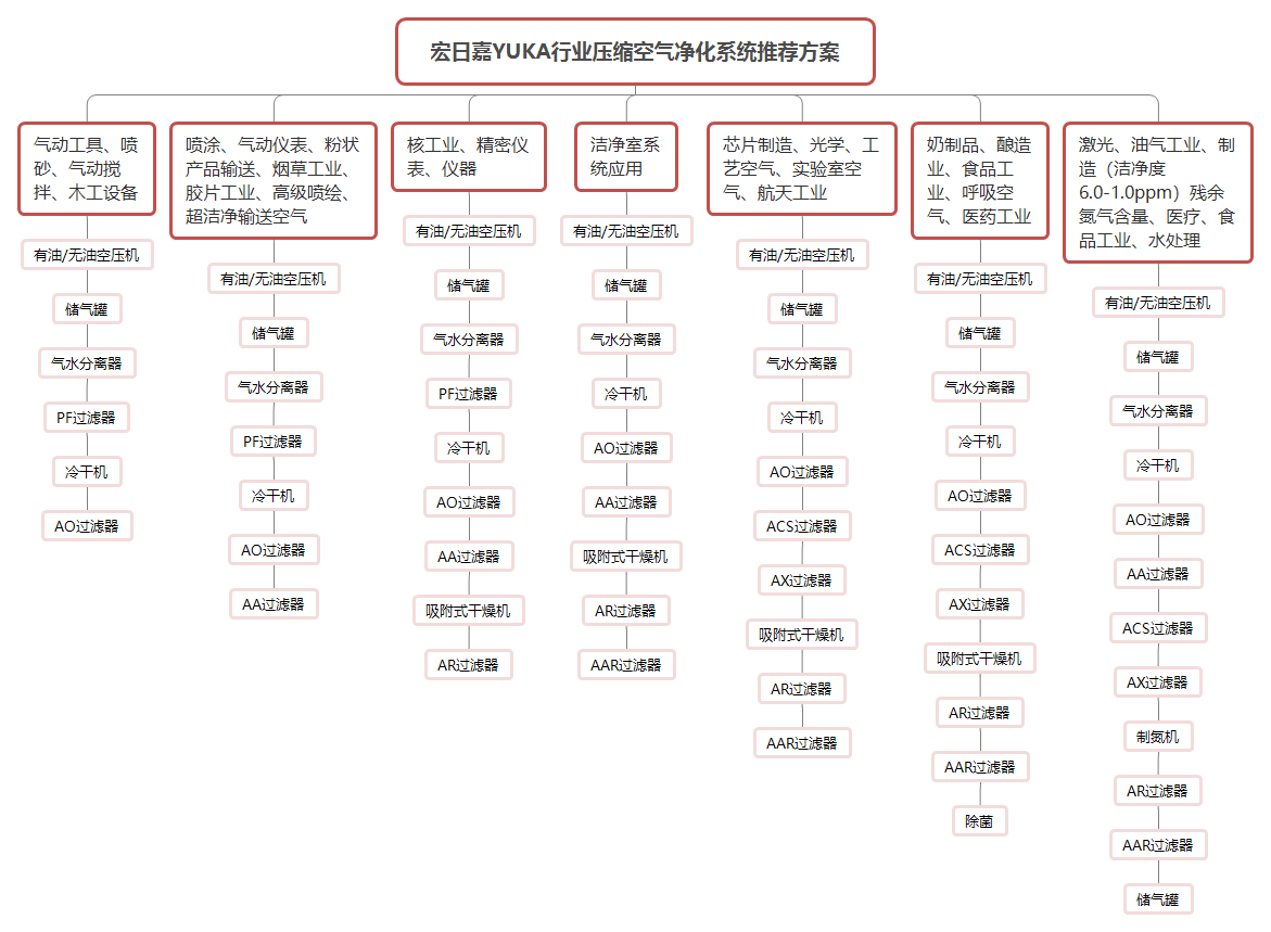 以下是深圳市宏日嘉針對(duì)部分行業(yè)壓縮空氣凈化系統(tǒng)推薦方案。